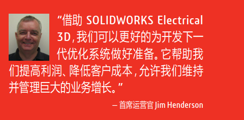 “借助 SOLIDWORKS Electrical 3D,我們可以更好的為開(kāi)發(fā)下一代優(yōu)化系統(tǒng)做好準(zhǔn)備,”Henderson 解釋道,“它幫助我們提高利潤(rùn)、降低客戶成本,允許我們維持并管理巨大的業(yè)務(wù)增長(zhǎng)。”