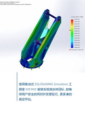 除利用SOLIDWORKS 設(shè)計(jì)工具(如在平臺(tái)被展開和移動(dòng)時(shí)利用設(shè)計(jì)配置來捕捉每個(gè)位置)和自動(dòng)創(chuàng)建最 優(yōu)工具外,SOCAGE 還依賴集成式 SOLIDWORKS Simulation 軟件來實(shí)現(xiàn)其總體目標(biāo),即確保用戶安全的同時(shí)開發(fā)更輕巧、更緊湊的高空平臺(tái)。