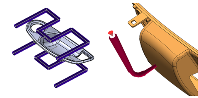 SOLIDWORKS Plastics可以根據(jù)流動的平衡自動選擇澆口的位置跟數(shù)量。綜合產(chǎn)品外觀要求,暫時采用設(shè)計如圖澆道,澆口位置位于澆道上端的位置。另外考慮產(chǎn)品的冷卻系統(tǒng)如圖。只需要在SOLIDWORKS中繪制草圖線就可以定義冷卻水路及澆道。