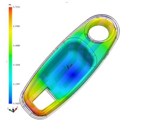 翹曲分析是基于冷卻分析過程,對產(chǎn)品成型后可能出現(xiàn)的變形以及形狀尺寸等進行分析,便于對成型過程進行優(yōu)化。從結(jié)果可知,總的變形量為0.71mm,如圖8所示??傋冃斡蓛刹糠謽?gòu)成,分別是材料本身熱脹冷縮導(dǎo)致的收縮變形和不同區(qū)域收縮不均或材料分子取向不平衡導(dǎo)致的翹曲變形。通過SOLIDWORKS Plastics分析,可以預(yù)測產(chǎn)品變形,為設(shè)計方案提供參考,從而減少試模次數(shù)。