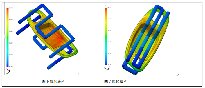 冷卻分析參數(shù)主要有塑件和模具的溫度、模具熱通量、冷卻結(jié)束時產(chǎn)品溫度及冷卻時間等。通過冷卻分析結(jié)果判斷產(chǎn)品冷卻效果,所需的冷卻時間,確定成型周期。如圖6所示,冷卻時間為10.34s,冷卻結(jié)束時產(chǎn)品溫度最高溫度為69.44℃,最低位56.20℃,冷卻效果較差。我們可以將冷卻水路進行優(yōu)化,將冷卻水路貼近產(chǎn)品。優(yōu)化后冷卻時間降低到9.04s,模面溫度降低到60攝氏度。優(yōu)化后的結(jié)果如圖7所示。